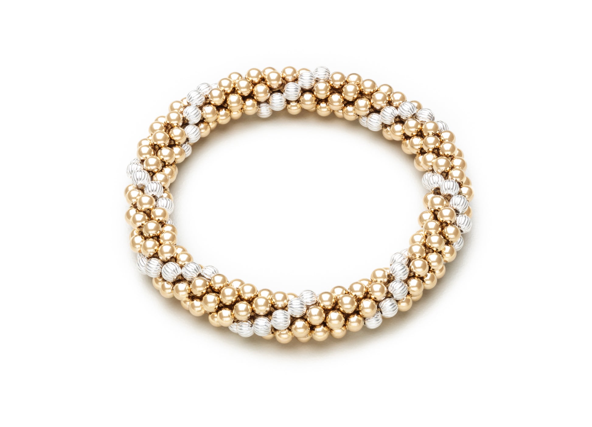 Designed as a 14k gold-filled cluster rollover bands, with sterling silver accents. Available in 4 mm and 3 mm beads (refer to the picture of the pair of bracelets to compare bead sizes). Standard wrist size.