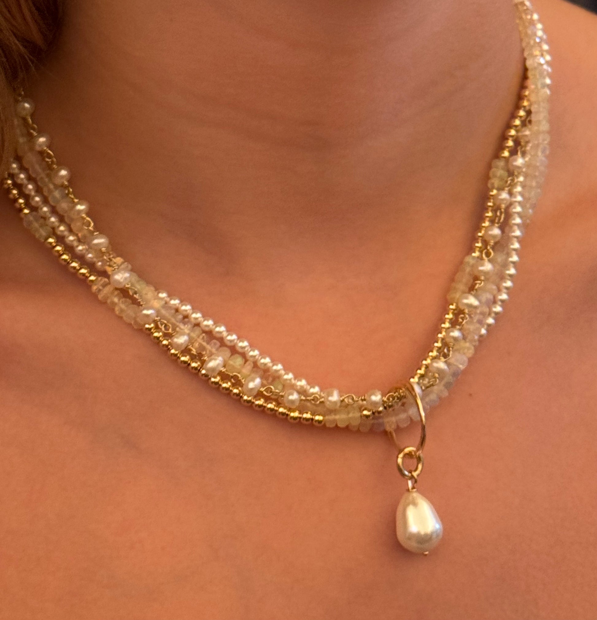 4 strand choker necklace with Opal and freshwater pearls. A large pearl pendant adds an attractive focal point.