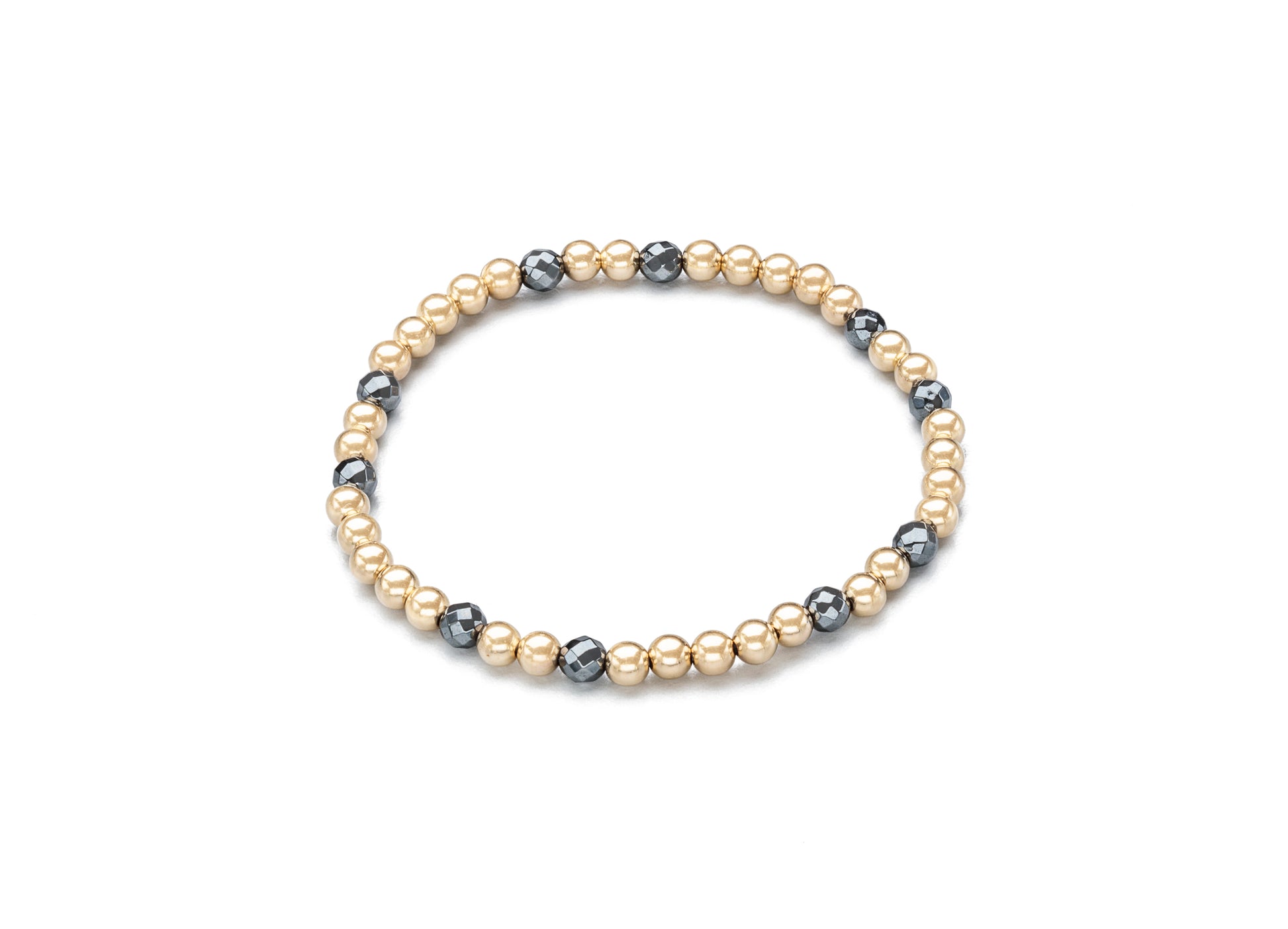Designed as a single elastic band of 14k gold-filled and hematite beads